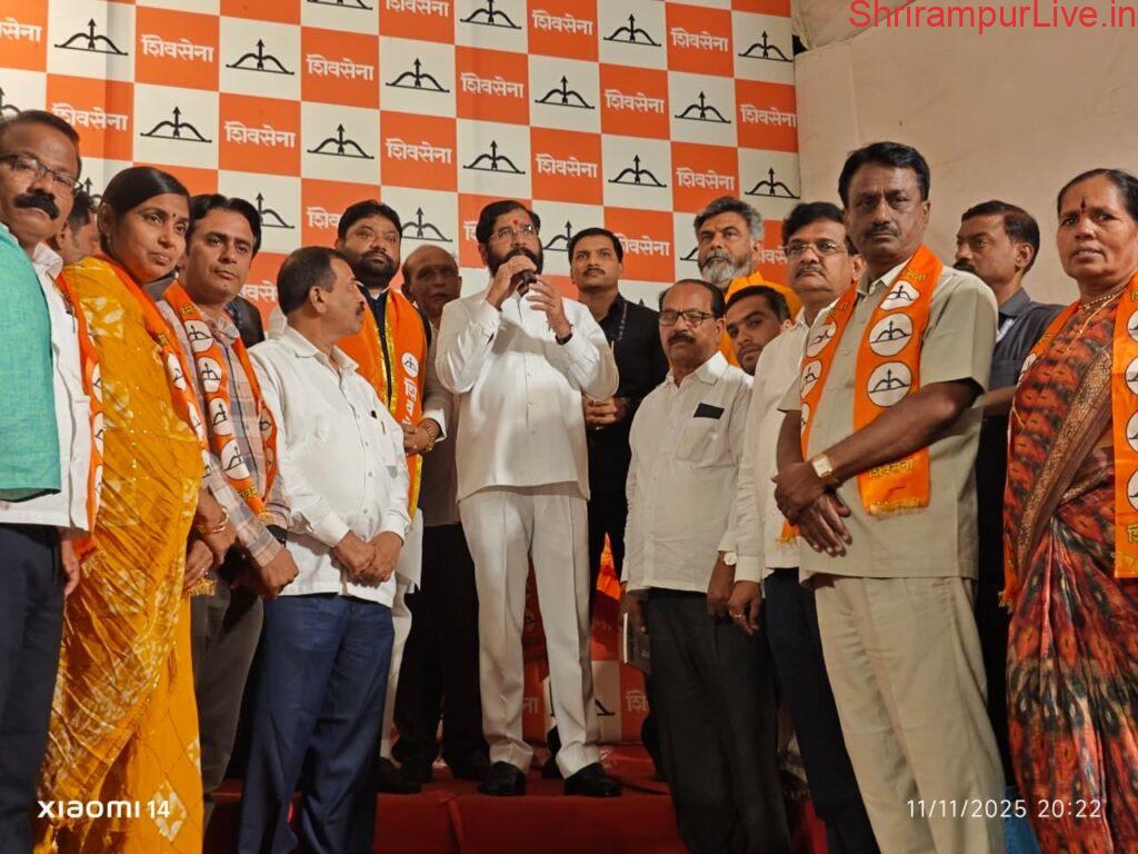 श्रीरामपूर नगरपालिका निवडणूकीच्या पार्श्वभूमीवर सध्या अनेक माजी नगरसेवक पक्षांतर करताना दिसत आहेत. आजही दोन माजी नगरसेवकांसह काही प्रमुख कार्यकर्त्यांनी राज्याचे उपमुख्यमंत्री एकनाथ शिंदे यांच्या उपस्थितीत मुंबई येथे शिवसेना पक्षात प्रवेश केला आहे.मुक्तागिरी या शासकीय बंगल्यावर एकनाथ शिंदे यांच्या हस्ते हा प्रवेश सोहळा पार पडला. माजी नगरसेवक मल्लू शिंदे आणि माजी नगरसेविका कुसूम शिंदे या दोघांसह सौ. रेखा सूर्यभान शेळके, सूर्यभान