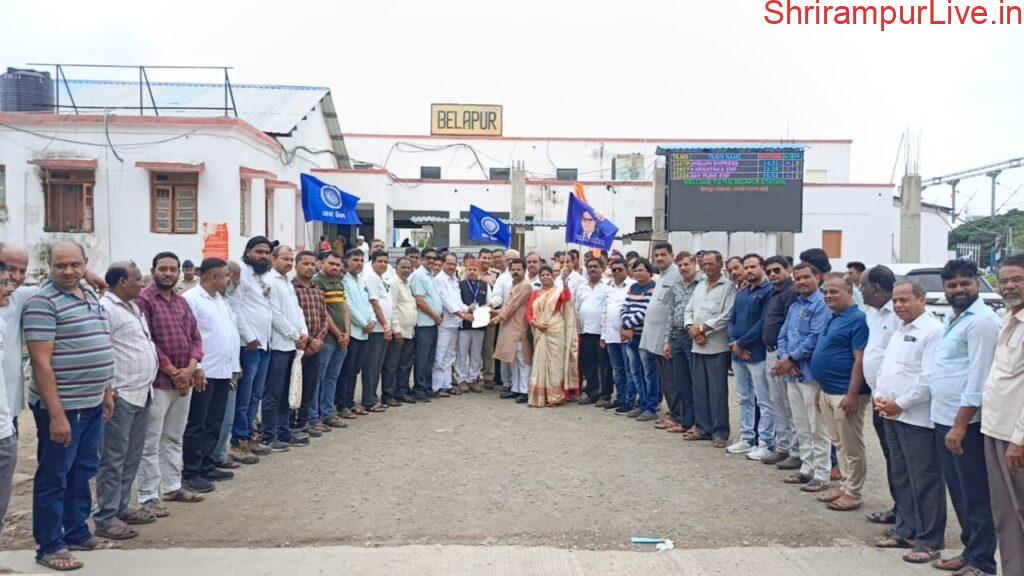 बेलापूर रेल्वे स्थानकावर वंदे भारत एक्सप्रेसला थांबा मिळावा, साई सुपरफास्ट पॅसेंजर रोज सुरू करावी तसेच कोरोना काळात बंद झालेल्या पॅसेंजर गाड्या पुन्हा सुरू करण्यात याव्यात या विविध मागण्यांसाठी सर्वपक्षीय रिपाईचे जिल्हा कार्याध्यक्ष सुभाष त्रिभुवन यांच्या नेतृत्वाखाली रेल्वे स्टेशनवर निदर्शने करण्यात आली. त्यावेळी रेल्वे स्टेशन मॅनेजर एम.पी. पांडे यांना माजी आमदार भाऊसाहेब कांबळे, सिद्धार्थ मुरकुटे, सुभाष त्रिभुवन, गौतम उपाध्ये, रंजीत श्रीगोड राजेंद्र सोनवणे, मुक्तारभाई शहा संतोष डहाळे, रमाताई धीवर अमोल साबणे विठ्ठल गोराणे यांच्या हस्ते निवेदन देण्यात आले.