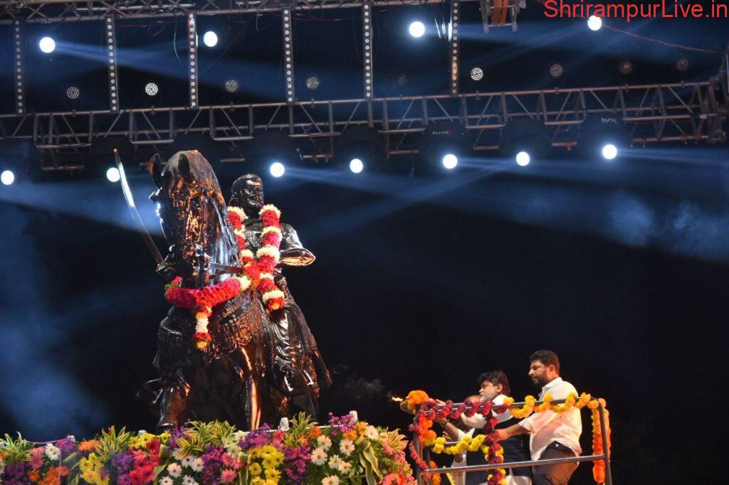 छत्रपती शिवाजी महाराज यांच्या पूर्णाकृती पुतळ्याच्या गेल्या ४० वर्षांपासूनची श्रीरामपूरकरांच्या स्वप्नपूर्तीची आज फलश्रृती झाली. सुमारे २० मिनिटांहून अधिकाकाळ सुरू असलेल्या फटाक्यांची अतिषबाजी व रोषणाईत डोळ्यांचे पारणे फेडणारा हा नयनरम्य सोहळा हजारो शिवप्रेमींनी आज अनुभवला. शिवसेना उपनेते,राज्याचे उद्योगमंत्री उदय सामंत यांच्या हस्ते व जलसंपदा मंत्री तथा जिल्ह्याचे पालकमंत्री राधाकृष्ण विखे पाटील यांच्या अध्यक्षतेखाली शहरातील भाजीमंडई समोर छत्रपती शिवाजी महाराजांच्या अश्वारूढ पुतळ्याचे अनावरण व लोकार्पण झाले.