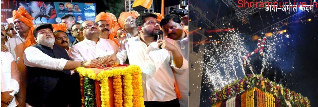 सायंकाळी साडेवाजात मंत्री सामंत व विखे पाटील कार्य़क्रमस्थळी दाखल झाले. यावेळी छत्रपतींच्या स्मारकासाठी आजपर्यंत योगदान देणाऱ्या आजी-माजी आमदार खासदारांचा सत्कार करण्यात आला. त्यानंतर छत्रपती शिवाजी महाराजांच्या अश्वारूढ पुतळ्याचे सामंत यांच्या हस्ते कळ दाबून अनावरण व लोकार्पण झाले. डाॅ. सुजय विखे यांनी आधीच जाहीर केल्याप्रमाणे करण्यात आलेली फटाक्यांची आतिषबाजी उपस्थितांचे डोळ्यांचे पारणे पेडणारे ठरले. महाराजांच्या पुतळ्यावरील अच्छादन बाजूला होताच श्रीरामपूरकरांनी जय भवानी, जय शिवाजी असा एकच जल्लोष केला. यानंतर सामंत, राधाकृष्ण विखे व डाॅ. सुजय विखे यांच्या हस्ते आरती करण्यात आली. यावेळी चित्रकार रवी भागवत यांनी साकारलेल्या ३५० फूट आकारातील तैलचित्राचेही अनावरण करण्यात आले.