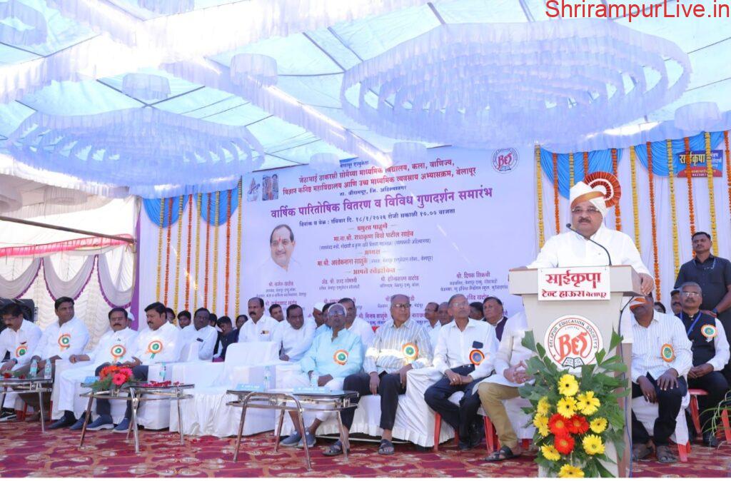 बेलापुर एज्युकेशन सोसायटीच्या जेटीएस हायस्कूल व कनिष्ठ महाविद्यालयाचे वार्षिक पारितोषिक वितरण समारंभ आणि सांस्कृतिक महोत्सवात प्रमुख अतिथी म्हणून ते बोलत होते. अध्यक्षस्थानी संस्थेचे अध्यक्ष अशोक साळुंके होते.यावेळी उपाध्यक्ष राजेश खटोड,सचिव ॲड शरद सोमाणी, दीपक सिकची, नंदुशेठ खटोड, बापूसाहेब पुजारी,रविंद्र खटोड, भरत साळुंके,श्रीवल्लभ राठी, चंद्रशेखर डावरे,ॲड.विजयकुमार साळुंके,नामदेव मोरगे,जिल्हाध्यक्ष नितीन दिनकर,उपाध्यक्ष दीपक पटारे, नगरसेवक श्रीनिवास बिहाणी,तालुकाध्यक्ष बाबासाहेब चिडे,शहराध्यक्ष जितेंद्र छाजेड,नानासाहेब पवार,गिरीधर आसने प्राचार्य दत्तात्रय पुजारी,उपप्राचार्य जयश्री घनकुटे,पर्यवेक्षक भानुदास खरात,कार्याध्यक्ष जनार्दन पुजारी, स्वागताध्यक्ष विवेक शिनगारे,विजय ताजने,विद्यार्थी प्रतिनिधी प्रणाली सराफ,वेदिका कर्पे,विद्या माळी,यजत शर्मा,रोहित बंगाळ,अभिषेक जाधव आदींसह अनेक मान्यवर उपस्थित होते. यावेळी बोलताना पालकमंत्री विखे पाटील म्हणाले की बेलापूर एज्युकेशन सोसायटीच्या उभारणीमध्ये संस्थापक प्रेमसुखशेठ खटोड, मुरली शेठखटोड वासुदेव कोळसे यांचेसह अनेकांचे योगदान आहे. आजकाल विद्यार्थ्यांना फक्त पुस्तके शिक्षण दिले जाते. मात्र ज्यांनी या देशाच्या स्वातंत्र्यासाठी बलिदान दिले आणि विकासासाठी योगदान दिले अशा शास्त्रज्ञांसह क्रांतिकारकांचा इतिहास विद्यार्थ्यांना माहीत असणे आवश्यक आहे. आजचे शिक्षण हे परिपूर्ण शिक्षण आहे का याचा आत्मचिंतन करण्याची गरज शिक्षण संस्थांसह शिक्षकांची आहे. बदलत्या काळानुसार विद्यार्थ्यांनी ज्ञान आत्मसात केले पाहिजे. आजकाल शिक्षण पद्धतीमध्ये फक्त घोकंपट्टी करून परीक्षेसाठी विद्यार्थी तयार केला जातो. ही पद्धत बदलण्याची गरज आहे. शाळेमध्ये शास्त्रज्ञासह देशाच्या विकासात योगदान असणाऱ्यांचे एक स्वतंत्र दालन असले पाहिजे .यापुढची पिढी तंत्रज्ञानाने परिपूर्ण पिढी असले पाहिजे विद्यार्थ्यांना काळानुरूप व्यवसायभिमुख शिक्षण देणे गरजेचे आहे. आपण जामखेडला जिल्हा विज्ञान प्रदर्शनासाठी गेलो असता त्या ठिकाणी अत्यंत उत्कृष्ट विज्ञानाची उपकरणे विद्यार्थ्यांनी तयार केलेली होते मात्र विज्ञान प्रदर्शनासाठी फक्त पाच लाखांचे अनुदान असल्याने विज्ञान प्रदर्शनात आयोजनात अनेक अडचणी येत असल्याचे समजल्यावर आपण हे अनुदान एक कोटी रुपयांचे केले.विद्यार्थ्यांमध्ये जगाबरोबर स्पर्धा करण्याची जिद्द जागवली पाहिजे. आजच्या विद्यार्थ्यांमध्ये उद्याचे शास्त्रज्ञ डॉक्टर इंजिनीयर दडलेले आहेत. त्याचा विकास होण्यासाठी आणि जगाची स्पर्धा करण्यासाठी विद्यार्थी तयार झाले पाहिजे.ते होण्यासा